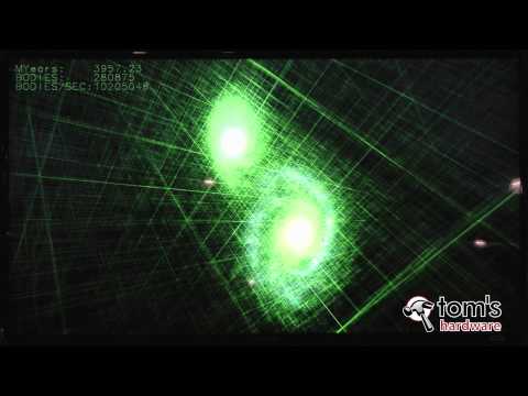 This is a demo of the interactions between the Milky Way and Andromeda galaxies, which will happen about 5 billion years from the present. The simulation not only calculates the gravitational reaction between the two galaxies but also calculates the interaction between the gravity of the individual stars in the two galaxies. The updated Maximus platform allows them to use ten times more particles (stars) in the simulation than the previous version. The system running this is a Lenovo D30 Thinkstation equipped with dual Xeon processors and the aforementioned combination of a Quadro K5000 and a Tesla K20.